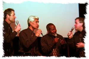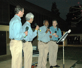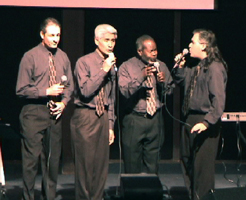 Here is an OLD (notice how much less gray hair there is!) photo of an early lineup. L to R is daniel, randy, riley, and bart. This was singing at the auditorium of Chaffey High (2000+ in attendance) for the SAJA 100 year school anniversary. |