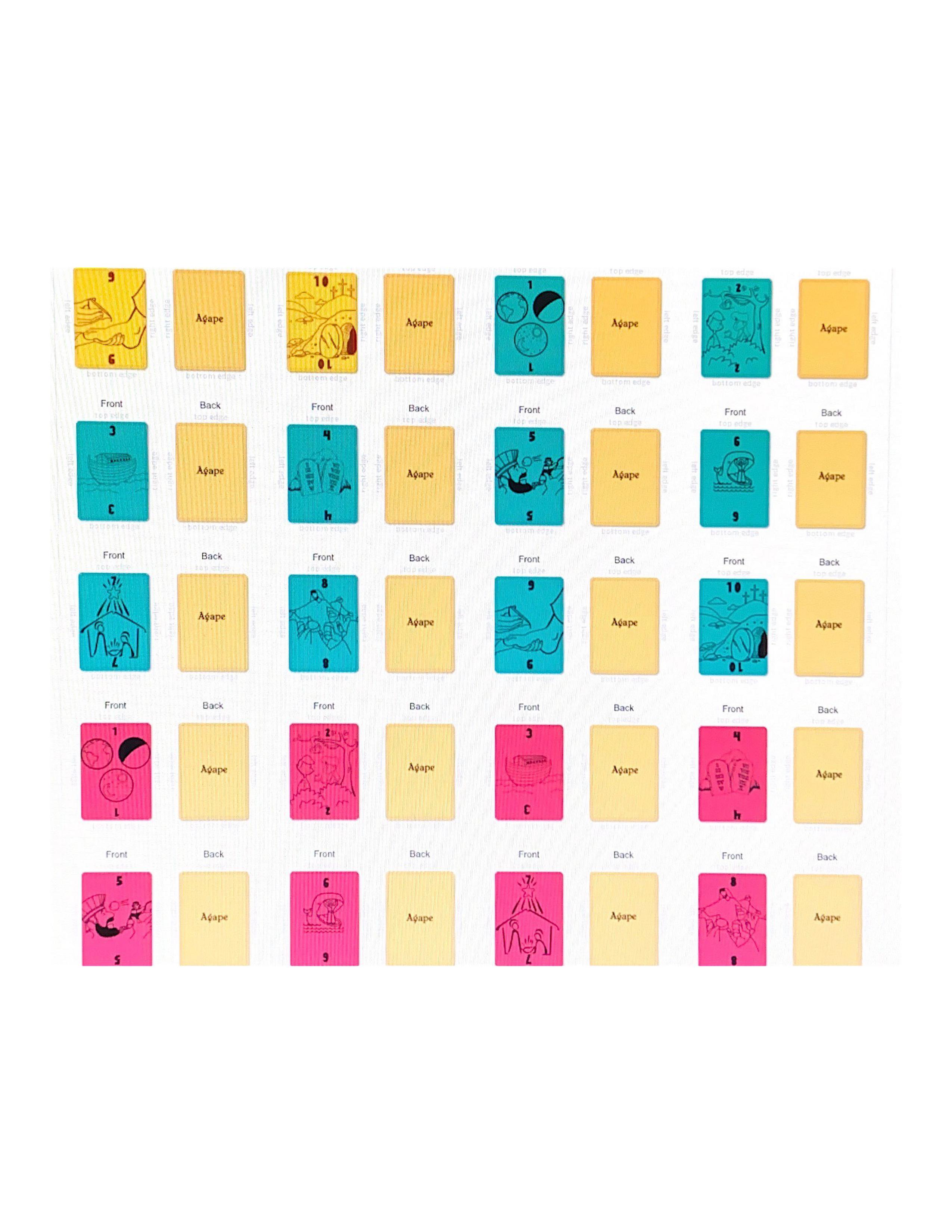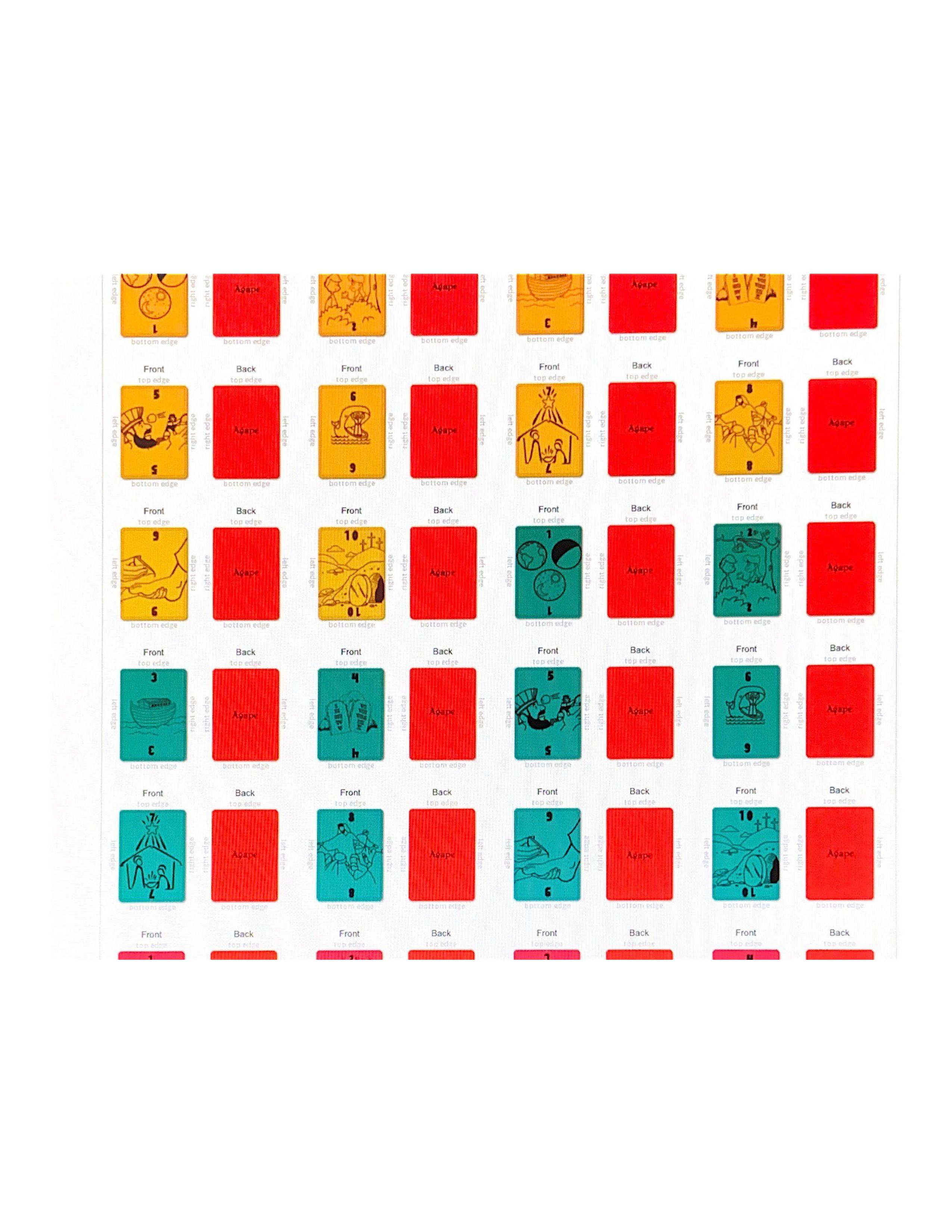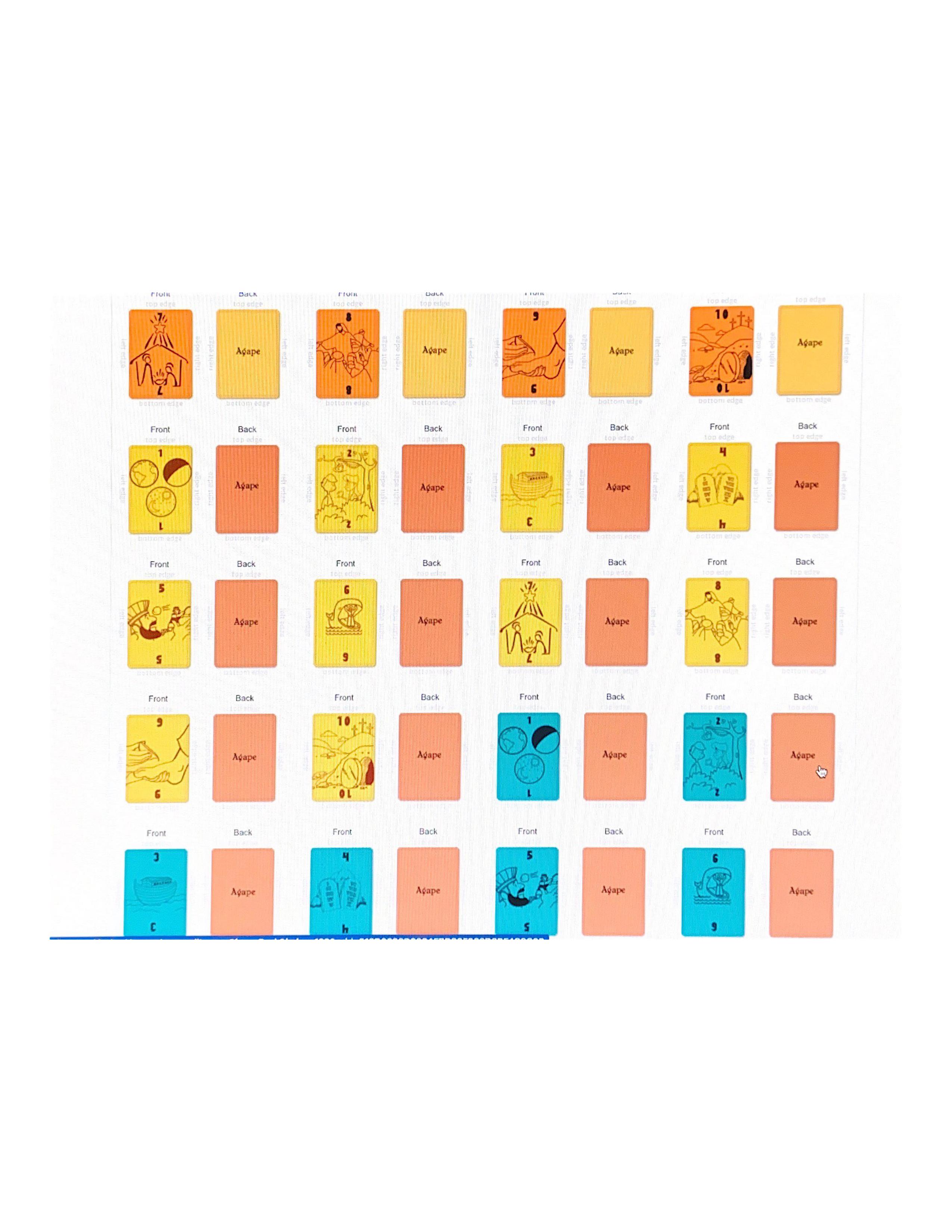 The game consists of four decks of 40 cards each, and can be played by two, three or four persons. Each of the four decks has a different color: orange, blue, yellow, and red . Each player chooses one of these deck piles and keeps it for the duration of the game, regardless of the number of hands played. The faces of these decorative cards are printed in order of significant stories in Bible History. Each player builds three basic groups of cards in front of him from which he will play the game. The groups of cards placed in position are referred to as the Cleansing, Blitz and Blessings Piles. Prime objective of the game is to build as many cards in sequence - 1 through 10 - in the same respective colors in the center Agape Piles for points toward the game, using as many cards from the Blitz Pile as possible. The first player to exhaust his Blitz Pile has "Blitzed" his opponents and ended the hand. Cards for placement in the Agape Piles can also be drawn from a player's Cleansing and Blessings Piles. Several hands, or rounds, must be played until a total of 66 (a.k.a. How many books are in the Bible) points are accumulated by any one player who then wins the game (See scoring Section). Speed is essential in winning since everyone plays at the same time! Agape Blitz is a fast-moving, exciting game for everyone. Don’t forget to be kind, fair, and respectful, just as God would!