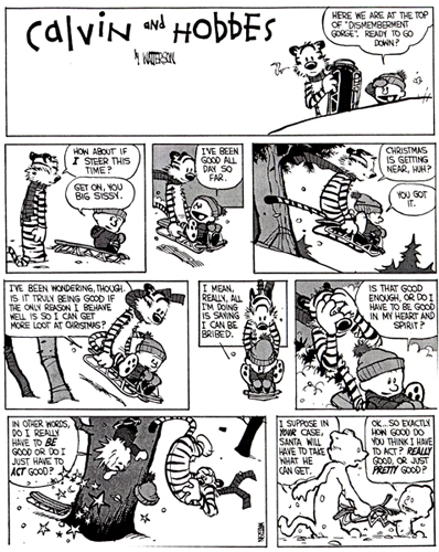 Bill Watterson has another strip where Calvin and Hobbes have a discussion on what it means to be good. We’ve got the ideas mixed up. We THINK salvation is based on behavior—or even believing the “right” things. But salvation is based on belonging to GOD. We are His children. We only respond to Him who first loved us.